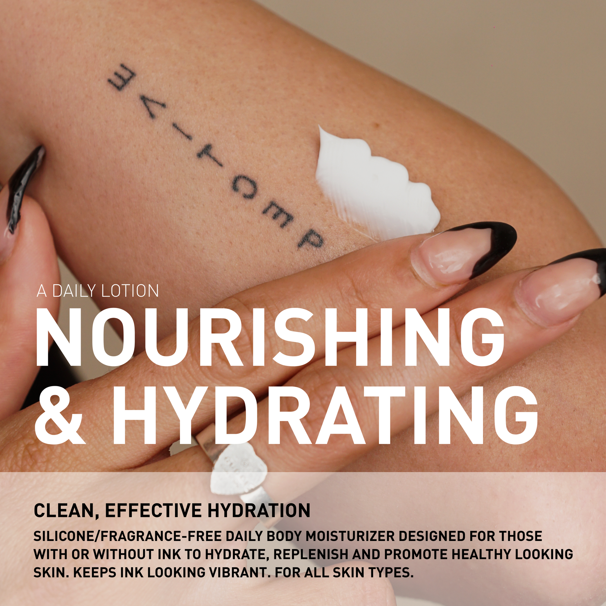 This fragrance-free tattoo lotion is a universal moisturizer providing lightweight, long-lasting hydration without leaving skin greasy. Nourishing plant oils and butters, plant derived ceramides lock in hydration while restoring the moisture to skin.