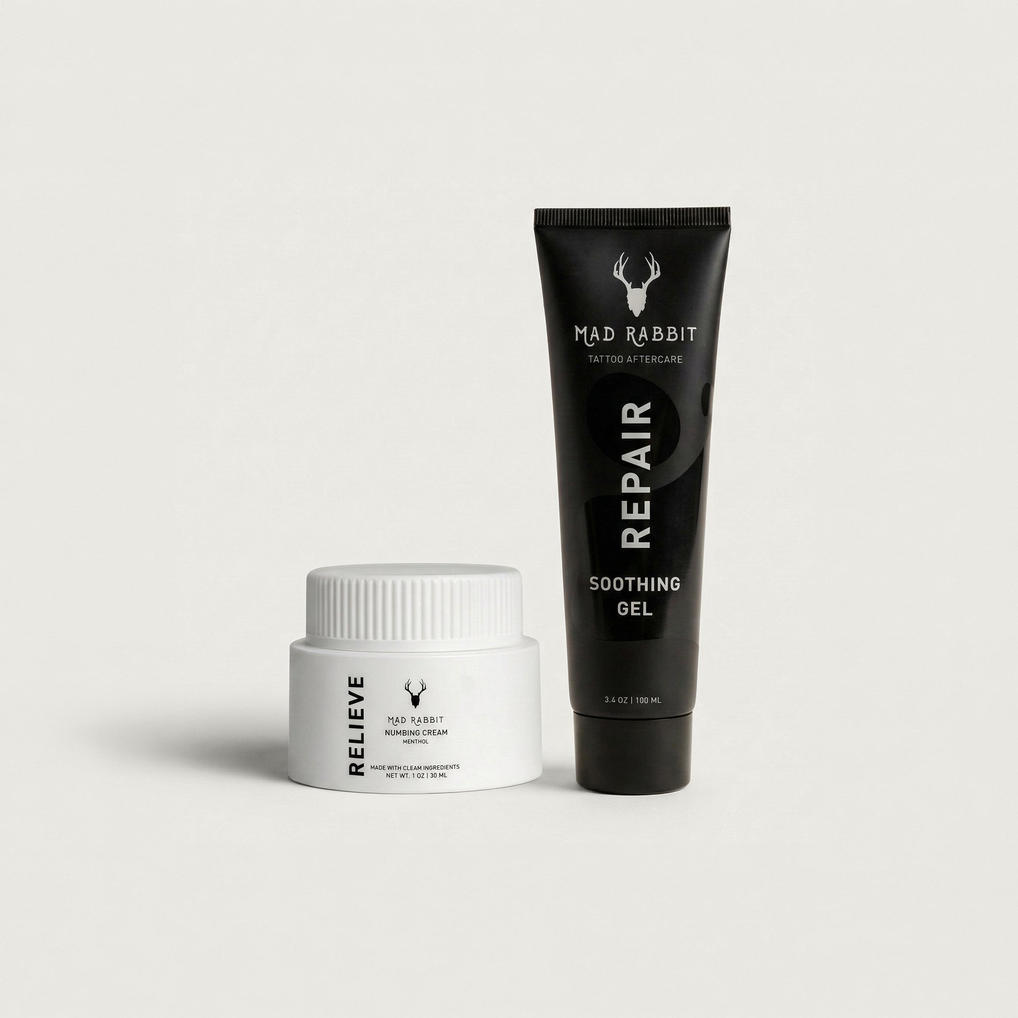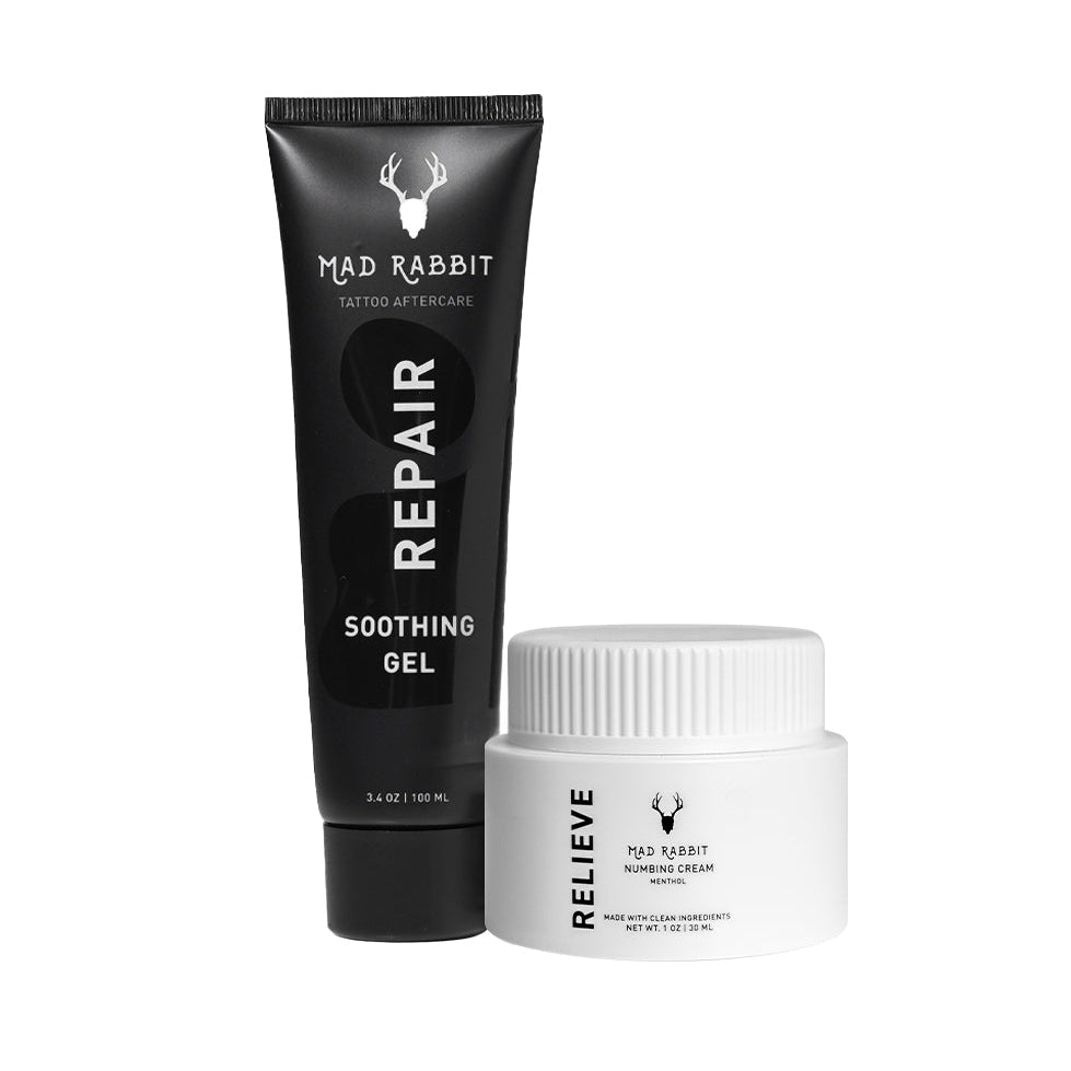 Thinking of getting a new tattoo? You need our New Tattoo Set. 60 minutes before your appointment, apply Numbing Cream to quickly numb skin & deliver fast-acting pain relief. After your appointment, use Soothing Gel for 14 days to aid in the new tattoo recovery process.