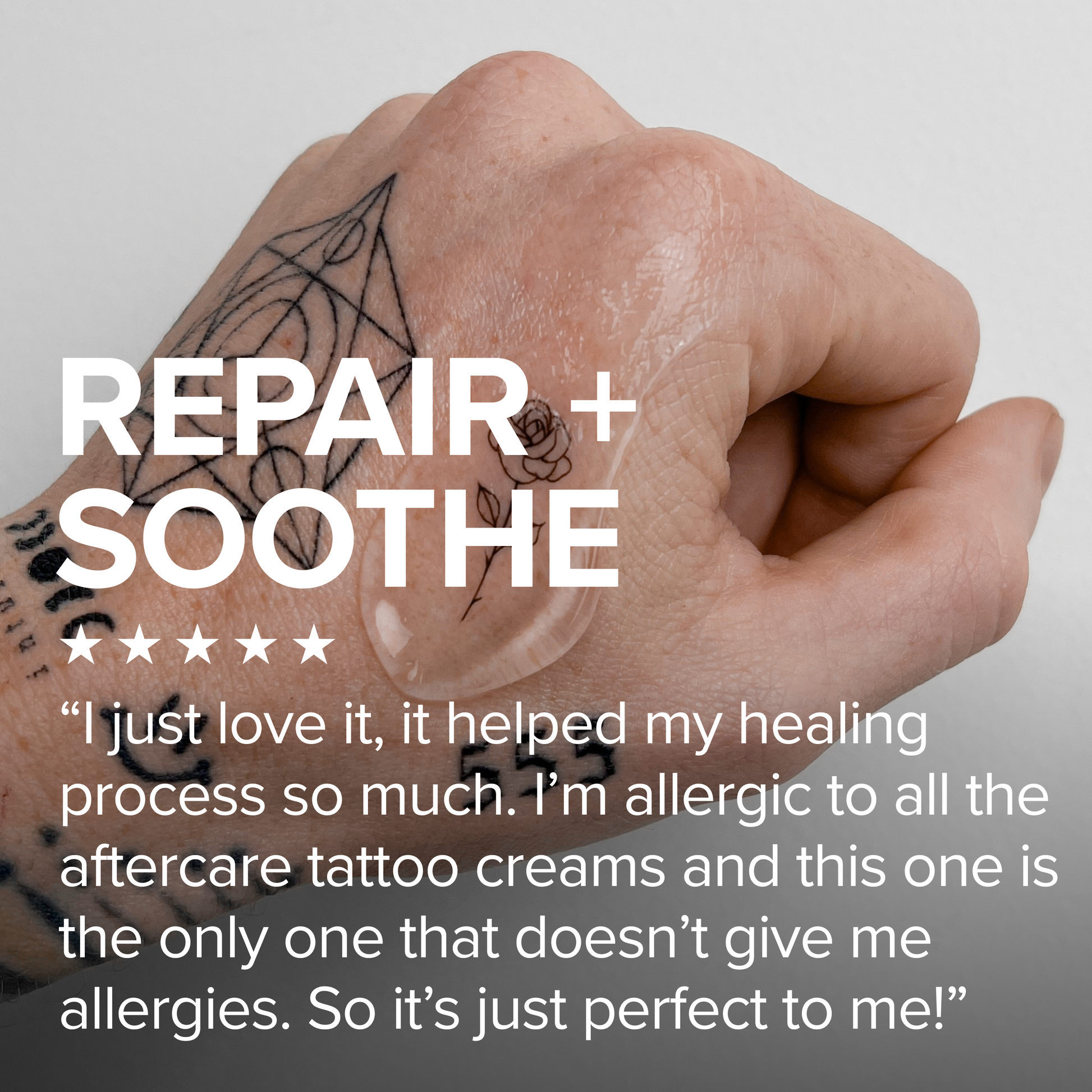 - Using clean hands, squeeze to dispense a generous amount of Soothing Gel to cover the new tattoo area.
